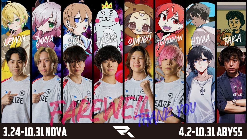 本日、契約満了に伴い、以下のメンバーがREALIZEを脱退する運びとなりました。 【REALIZE ABYSS】ともろう(@__tomorow)/ Simubo(@simubo)/ H1yaA(@h1ya_a)/ TAKA(@FPS_Snowball) 【REALIZE NOVA】SIZU(@sizu_fps)/ Ail3iS(@Ail3iS)/ inkya(@F... -